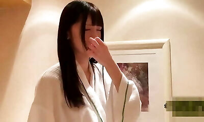 Cute 18-year-old dark-hued-haired Japanese with diminutive tits gets creampie sex and blowjob in her shaved vulva. Uncensored