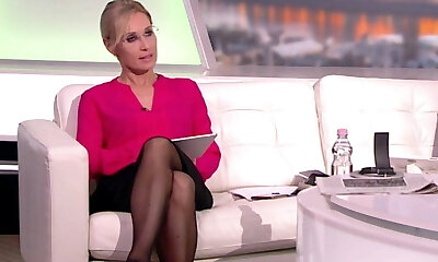 Long legged tv host in black pantyhose and high-heeled shoes 10